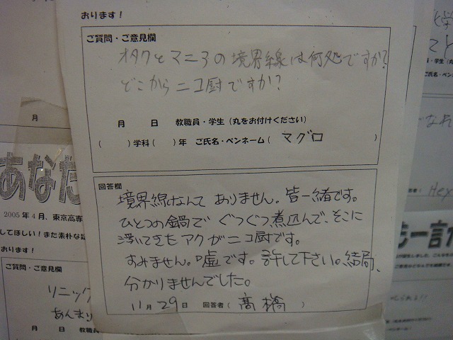 イヤッホゥ…。 さて、今回は久しぶりにマグロネタです。 今確認したところ一番最近に書いたマグロネタがコレ。 もうすぐ3ヶ月て…。 でまぁせっかくなのでマグロの旬がいつなのか調べました。 えと…、キハダマグロが夏(6~8月)で、 本マグロが冬(12~2月)だそうです。 前回のマグロの投稿が夏の終わり…。 そして今が冬の始まり…。 これくらい空いたのも何故か納得できます。 じゃぁそろそろ本題行きましょう。 先日、突然友達に 『グツグツ煮込んでそこに浮かんできたアクなんだって』 と言われました。 最初は何のことかわからなかったんですけど、 すぐに思い当たるものが浮かんだので、 購買横の一言コーナーへ言ってみると…。 ↓こんなんありました。 しかもペンネーム『マグロ』て。 言っとくけどここでのマグロは自分やないからね。 他人の名前を勝手に使うとは…。 いゃまぁ誰がやったかは知ってるんやけど。 とりあえず高橋さんお疲れ様です。 第一、オタとかマニアとかニコ厨の境界線を自分がわざわざ聞くわけないじゃん。 そんなモン聞かなくたって 自分は純粋な一般人なんですから♪ 大昔は一言カードにこんなんもあったし、 一言カードのご利用は計画的にね(何 では。 最後に連絡…、 前回の記事で一部不適切な表現がありましたことを深くお詫び申し上げます。 また、該当する記事は無期限に非公開とさせていただきます。 PR