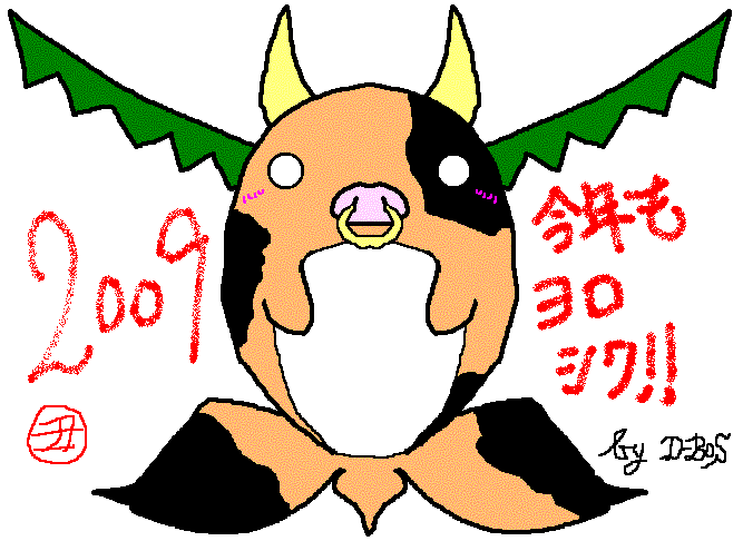 または、 寒中お見舞い申し上げます。 いゃはゃ、2010年ですか…。 あんまり実感がありませんね。 例年通りならば新年1発目は新年勤行会がネタにあがるのですが、 今日はクソが仕事のため、勤行会は明日に繰り越されたみたいです。 やっぱり行かなアカンのかな…。 その代わりに今日はスーパーな祖父の家に行ってきました。 いつも家族(+α)の3人で行くときは クソが勝手にテレビ見るわ飯催促するわ昼寝するわと 非常識全開の大嵐を巻き起こすんですけれども、 今日は母親(別名:あのちっちゃいの)と2人ということで、 かなりマッタリと過ごせました。 それで先ほど帰ってきたところなんですが、 さっそくこんなん描いてみた。 …もはや元がなんだかよくわかんない。 去年1年でかなり ちゃんと去年よりも丸くしてみました。 朝2年半ぶりに体重計に乗って絶句したのは秘密。 ちなみに去年はこんなにシャープでした。 まぁとにかく、 ぺいんとくぉりてぃばんざーい。 あ、でもって新年早々お知らせ。 前回のコメントに書いてあるとおり、 BGM音量を調整し直した【微修正版】を 早ければ明日あたりにうpしたいと思います。 決して"lazy"じゃないんだぜ(黙れ なので1秒でも早く聴きたいぜ、 もしくは音量バランスなんか気にしないぜ、 のどちらにも当てはまらない人は 明日くらいまで待ったほうがいいかもしれません。 なんかグダグダだ~。 もうアレだね、今年1年こうなるんじゃねっていう雰囲気が出てるね。 うん、きっとそうなります。 そんなわけで、昨日とほとんど同じ文句になりますが、 今年もD-BOS、 そして『自分と野球とブラック(?)と。』を ヨロシクお願いします。 ではでは。 すぺしゃるさんくす(ry PR