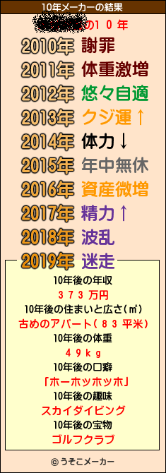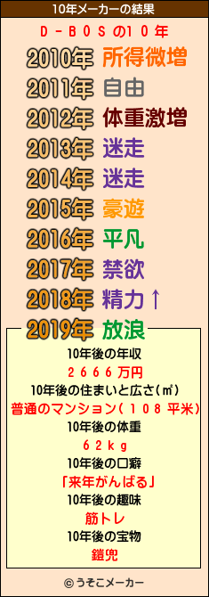 世間じゃ成人式がどうとか騒いでいます。 どうも、D-BOSです。 もうすぐ成人式ってことはそろそろ台風が来る季節ですか。 今年はどんなメンバーで来るのかなぁ…。 末っ子が来ようモンなら全力で 「ノートパソコンがカラフルになるぅ~」を阻止しなければ。 …うん、いきなり初手で古参じゃないとわからないネタってよくないね。 しかしまぁ、2010年ですよー。(遅 去年1年はホントにいろいろありました。 良いこと、嬉しいこと、楽しいこと。 ところで、自分も人間です。 いゃ、マグロでした。ごめんなさい。 どちらにしても生き物です。心があります。 そこで、去年1年いろいろあって何か心境に変化が生まれたのか。 やってみましょう、懐かしの心理テスト。 まさかの「以下略」で別モノに回したんだっけなぁ。 …うん、2手目も比較的古参じゃないとわからないネタってよくないね。 というわけで、1年半ぶりに恋愛心理テストやらをやってみました。 では早速その結果を…の前に。 今後の未来を占う意味で、うそこメーカーさんの10年メーカーやってみました。 左側がD-BOS名義で、右側が本名でです。 なんかD-BOS名義が本名より全体的に1年遅れてる気がします。 現実で事が起きても、受け入れるのに多少時間が必要になって、 D-BOSのプロフィール変更が遅れてしまう。 みたいな感じなのかな。 自分で書いててよくわからなくなったけど。 とりあえず、HNのが金稼いでるのが許せない。 ネット内で豪遊しながら現実は年中無休とかもね。 それでは恋愛心理テストの結果を。 ◆あなたの性格 … アグレッシブ 何でも自分の力で解決しようとする努力の人。 我が道を信じ、自分の意見を力強くアピールするので、煙たがられることもしばしば。 何事にもゴリ押し一直線なので周りは疲れます…。 ◆恋人に望む物 … 体の相性 あなたにとって一番大切なのはエッチの相性。 体が合わなければ愛情も芽生えない。 むしろ愛情なんて必要なくて、体だけしか目当てじゃない肉欲全快人間! ◆別れた時 … ズット忘れられないタイプ 別れた相手の事が忘れられず、ずっと想いを寄せてるタイプ。 新しく恋人が出来ても、 「やっぱり前の恋人の方が良かったよ…」 なんて愚痴をこぼすでしょう。 愚痴を聞かされる友達の気分も考えてみなさい。今をもっと大切に! ◆結婚願望 … かなり強い 結婚願望強すぎ!「結婚したい!」と聞かされ続けて、 田代もビックリの”耳にタコ”状態の友達や恋人の気にもなってみなさい。 願望が強すぎると婚期が遅くなるので程ほどにね。 ◆恋愛におけるエッチの比重 … 普通 エッチとそれ以外の両方を重んじるタイプ。 よく言えば考え方が大人ですが、実は平凡な恋愛を求めています。 ◆恋人に対する態度 … 束縛するタイプ つい些細なことまで口出ししてしまう神経質っぷり発揮! 常に口論になっているでしょう。 ◆ストーカー度 … ストーカー予備軍 いつも「あの人が自分の恋人だったら良いのになあ。」と妄想しているあなた。 妄想の世界ではお互い同棲生活していて、どんな時も一緒のアツアツぶり。 …さあ、空想の世界ばかりじゃなくて、現実を見ようじゃないか! 「結婚願望」と「恋愛における(ry」が変わりました。 普通だってよ、普通。初めて見た。 これなら1年半前に得た妄想肉欲獣の称号を返上でき…、 ヒント:「恋人に望むもの」「ストーカー度」 …はい、できないですね。ごめんなさい。 ではでは。 …うん、最後は古参じゃなくても自分が危ない子だってわかるネタで …よかねぇよ。 PR